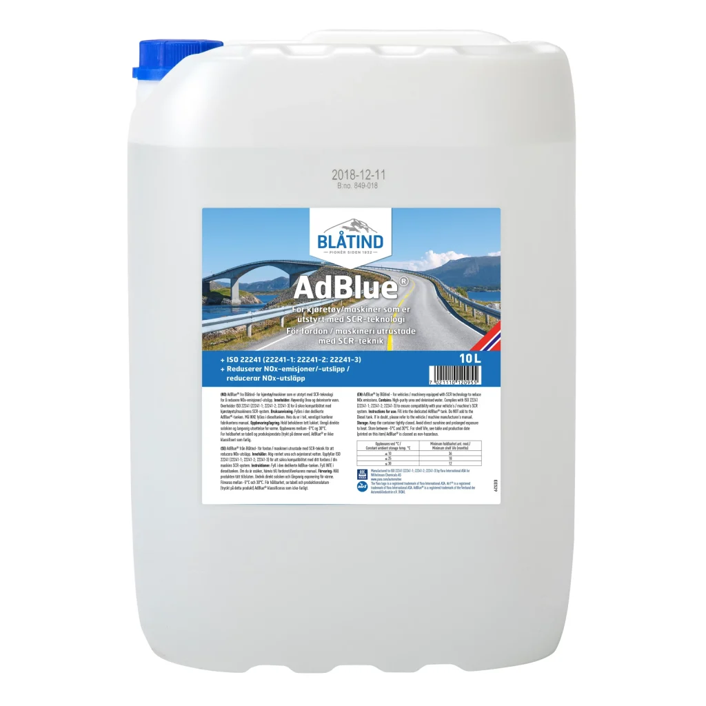 Blåtind AdBlue® brukes i kjøretøy/maskiner med SCR-teknologi for å redusere NOx-emisjoner/-utslipp. AdBlue® skal ikke lagres ved temperaturer over 30℃ eller i direkte sollys. Produktet overholder ISO 22241 for å sikre kvalitet og kompatibilitet med SCR-system.