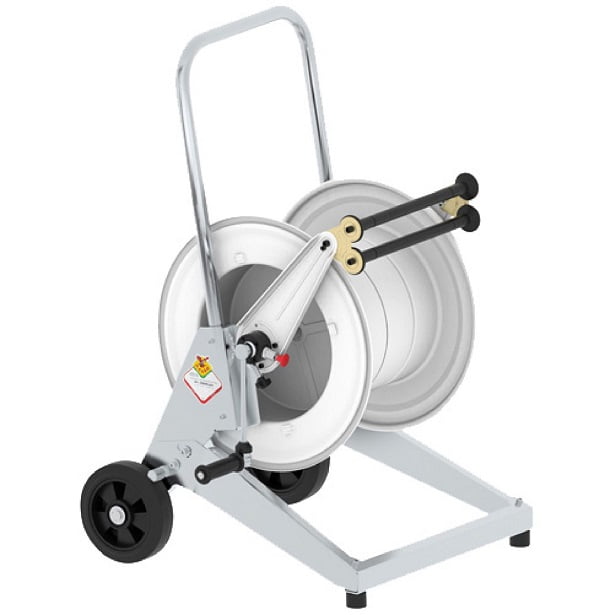 Meget solid slangevogn i galvanisert stål med en påmontert manuell slangetrommel i lakkert stål med plass til opp til 60 meter 3/4″ slange. Vognen har som standard automatisk lås på hjulene når den står parkert, slangeguide, justerbar klutsj og rotasjonslås på trommelen. Trommelen har svivel i messing med viton tetninger. Leveres med 60 meter 3/4″ l.t.slange og 2 meter inlet slange.